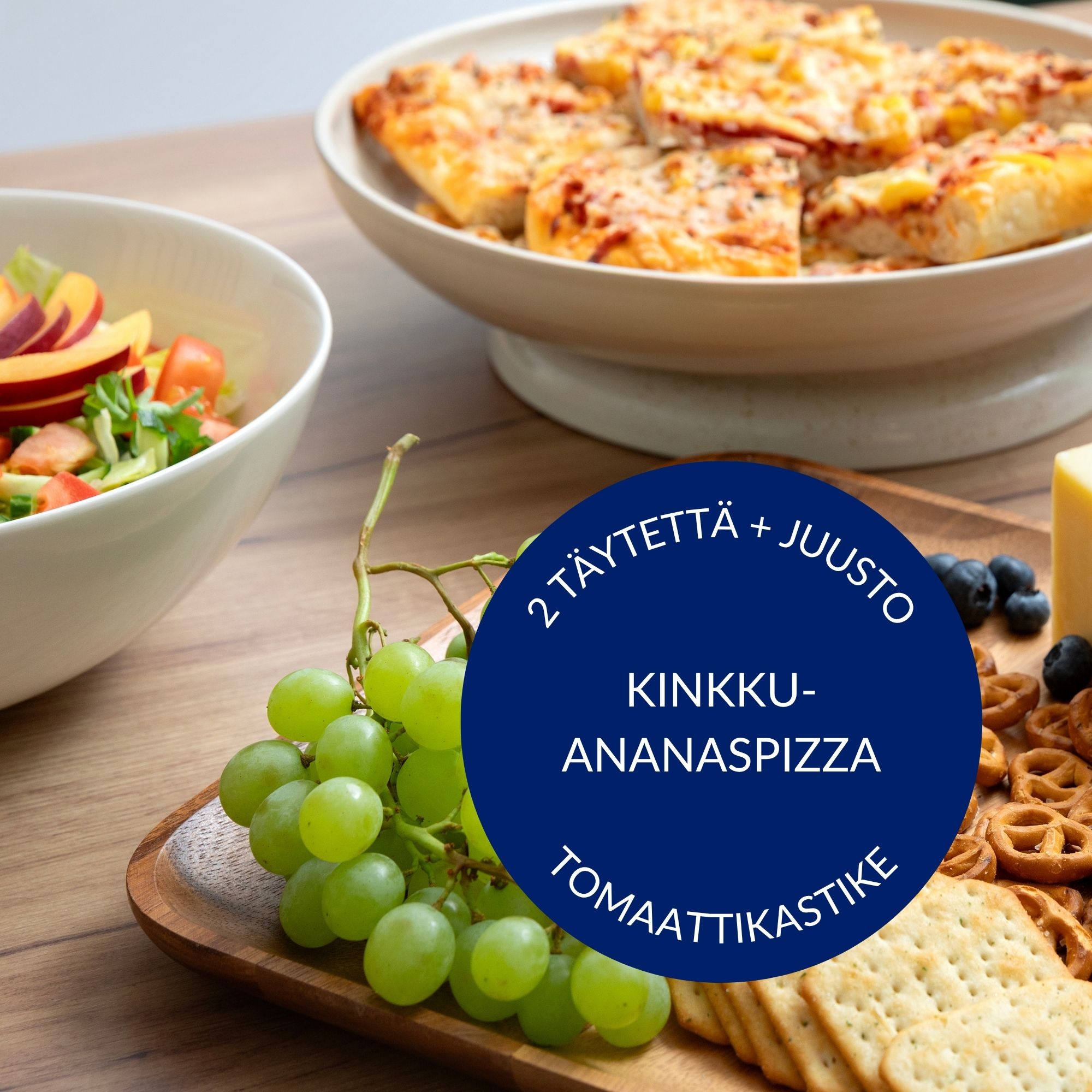 Kinkku-ananaspizza, salaatti + alkoholiton juoma (kivennäisvesi / limsa)